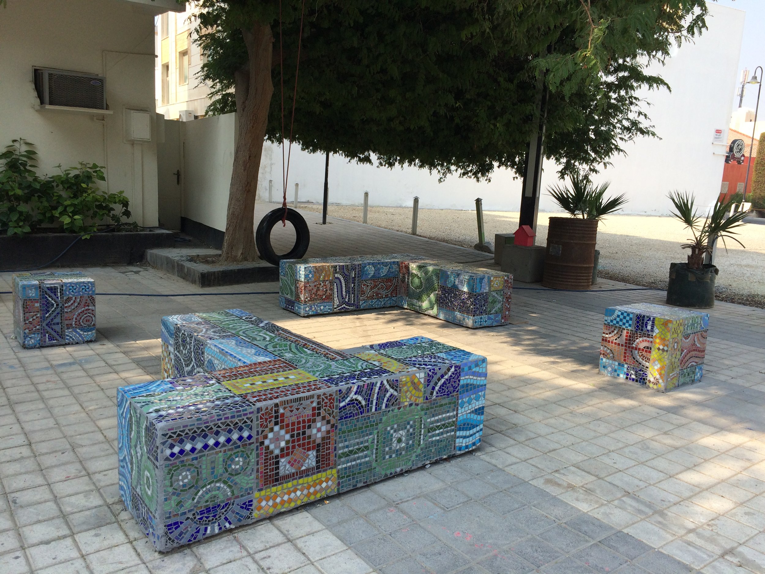 The refurbished benches pictured above are a permanent feature in Adliya for the public's use and enjoyment. The intricate designs and vibrant hues of the mosaics continue to captivate passersby, offering a welcoming and artistic seating option for visitors and residents alike. Despite the passage of time, these benches stand as a testament to the community's creativity and commitment to beautifying shared spaces, enhancing the character of Adliya's bustling restaurant district.
